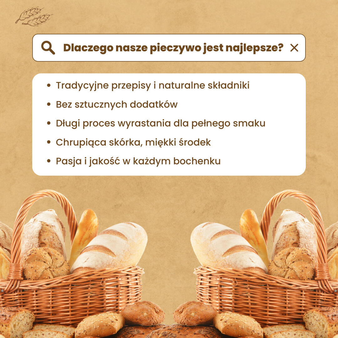 Skupiliśmy się na budowaniu emocji – ciepła, autentyczności i tradycji. Wybraliśmy naturalne odcienie brązu i beżu, które oddają klimat świeżo wypieczonego chleba. Grafiki zostały wzbogacone o fotografie pełne detali – chrupiące skórki, sypiąca się mąka, ujęcia z wnętrza piekarni. Każdy element został zaprojektowany tak, by działał zarówno w postach, jak i reklamach online.